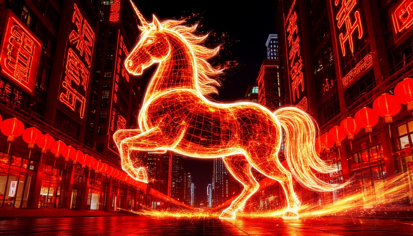 Азиатская эстетика: «Широкий эпический кадр, ночной мегаполис. На фоне небоскрёбов, украшенных неоновыми иероглифами, мчится величественная Огненная Лошадь из света и искр. В отражении стеклянных фасадов видны силуэты традиционных красных китайских фонарей. Стиль кинематографичный, динамичный, цвета — глубокий красный и золотой».