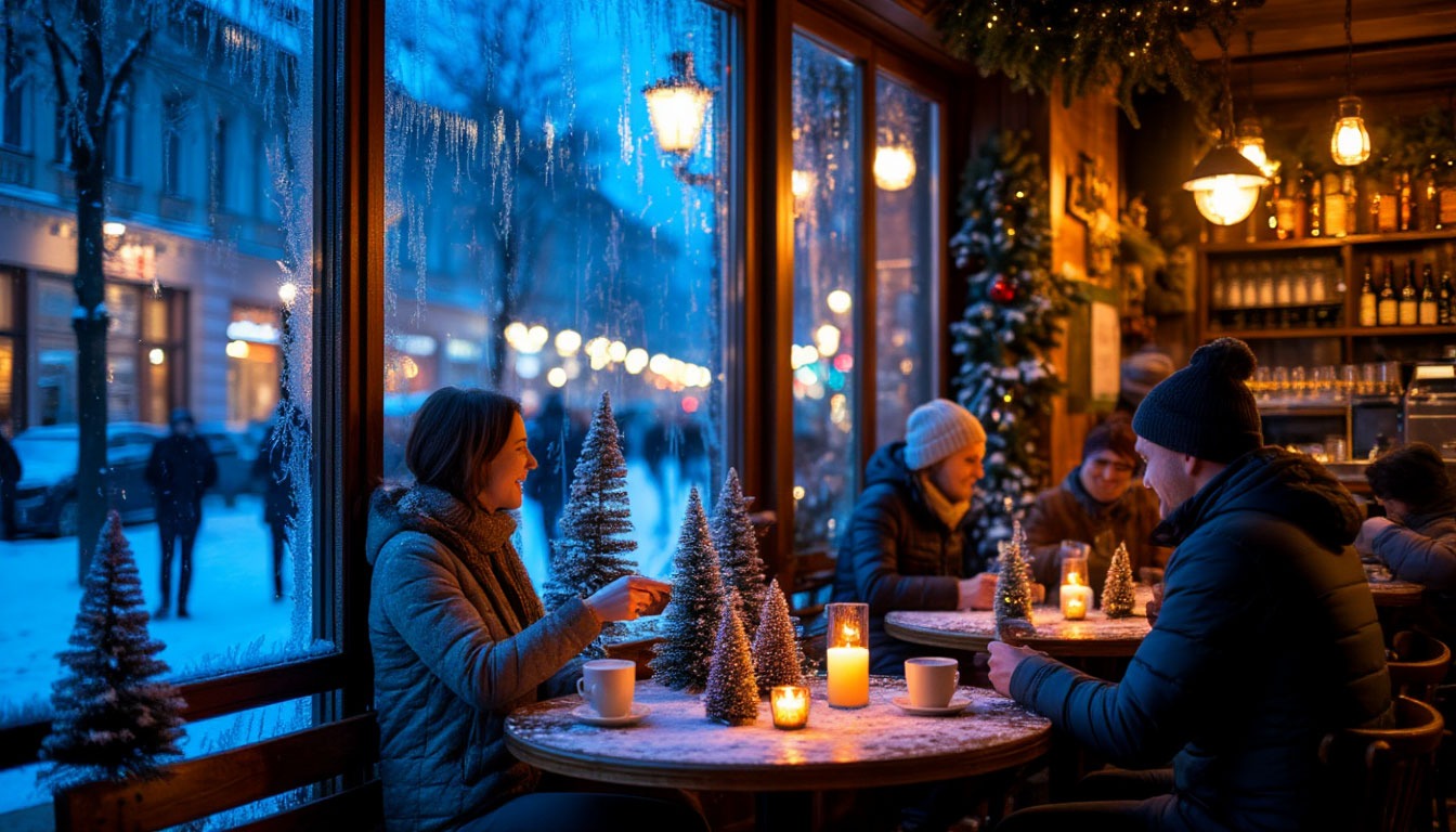 5. «Новогоднее кафе»: Through a frosty window at night, view of a cozy European-style cafe interior. People laugh at wooden tables adorned with small fir trees and candles. A barista prepares a festive drink. Streetlights glow softly on the snowy street outside. Photorealistic, shallow depth of field, glowing warmth vs cool blue outside.