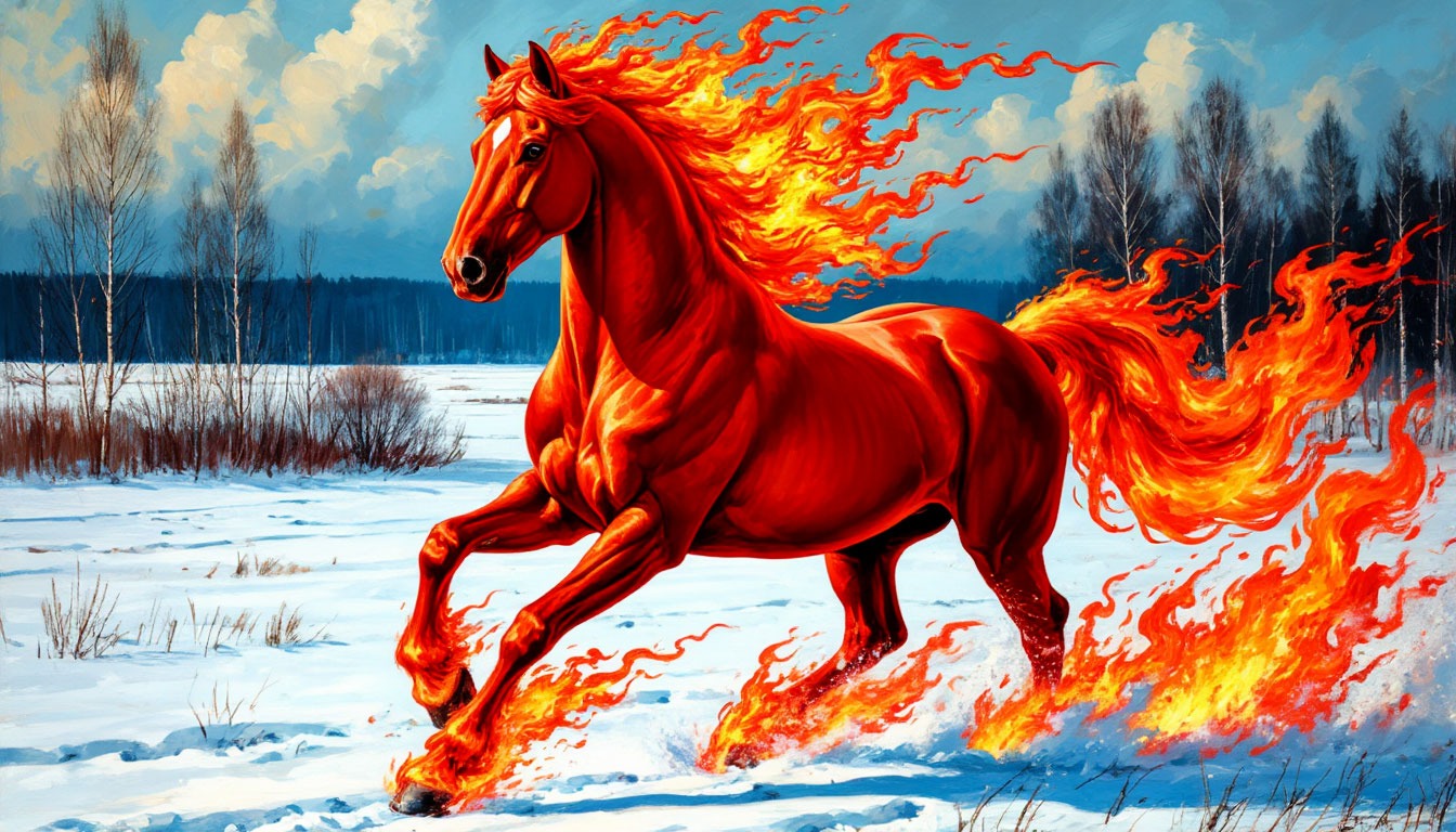 1. «Встреча года Лошади»: Epic wide shot, a majestic, muscular steed made of glowing embers and molten lava (Fire Horse) gallops across a snowy, starry night sky above a tranquil ancient Chinese village. Its hooves kick up sparks that transform into blooming peonies. Below, red lanterns glow warmly. Digital painting, style of Greg Rutkowski and Thomas Kinkade, rich colors, magical realism, hyper-detailed.