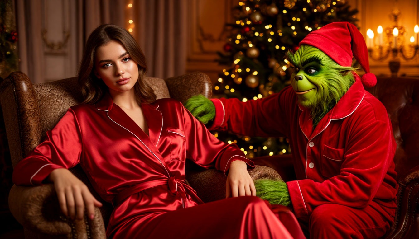 Для соцсетей или открытки: «Модная фотография, уютный рождественский интерьер. Молодая женщина в насыщенно-красном шелковом халате расслабленно сидит в кресле. На заднем плане — нарядная елка с тёплой гирляндой. Рядом с ней забавный, немного неуклюжий Гринч в красной пижаме с сосредоточенным видом делает ей маникюр. Чистый студийный свет, высокая детализация тканей и кожи, атмосфера легкого праздничного абсурда и уюта».
