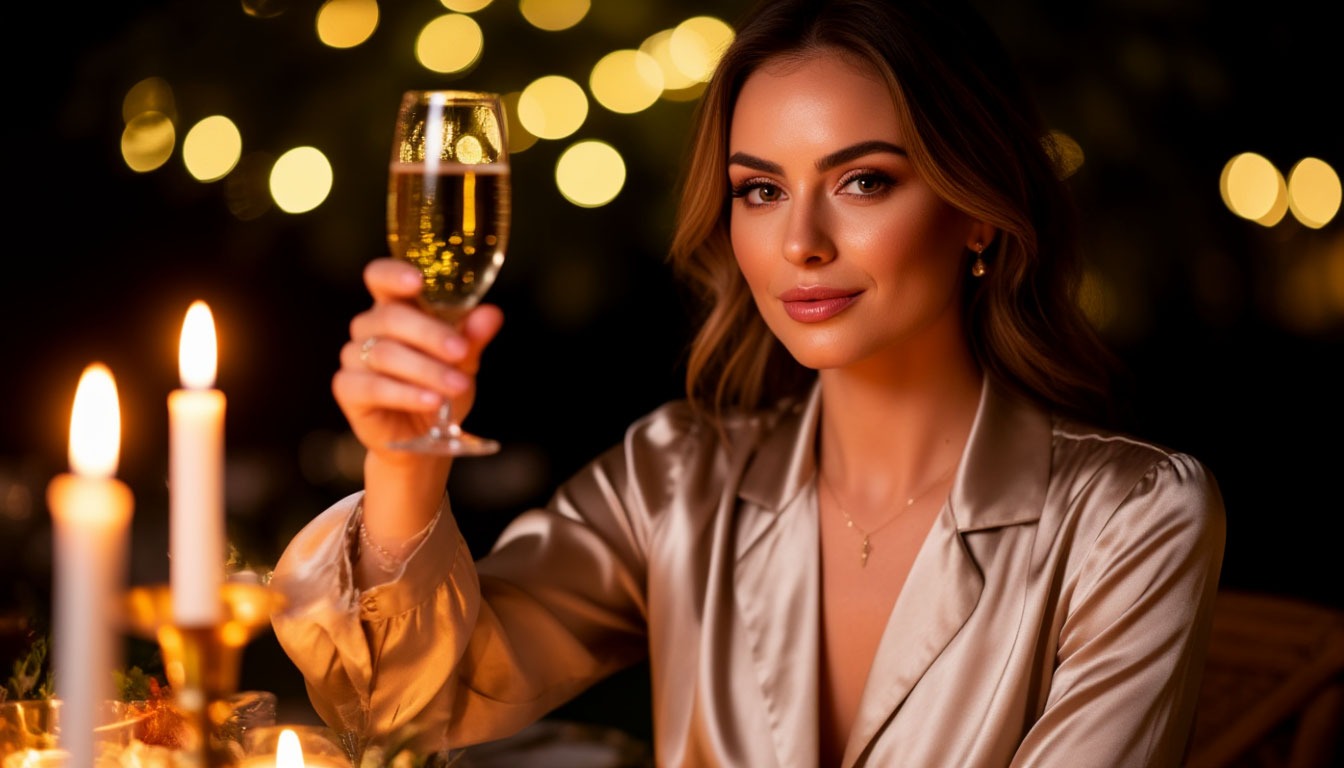2. «Праздничный натюрморт»: A lavish still life on a vintage wooden table. Composition includes a half-peeled mandarin, a sprig of fir, sparkling champagne in a crystal flute, golden Christmas ornaments, burning cinnamon candles, and a red silk ribbon. Warm, cozy light from the left, shallow depth of field, photorealistic, 8k.
