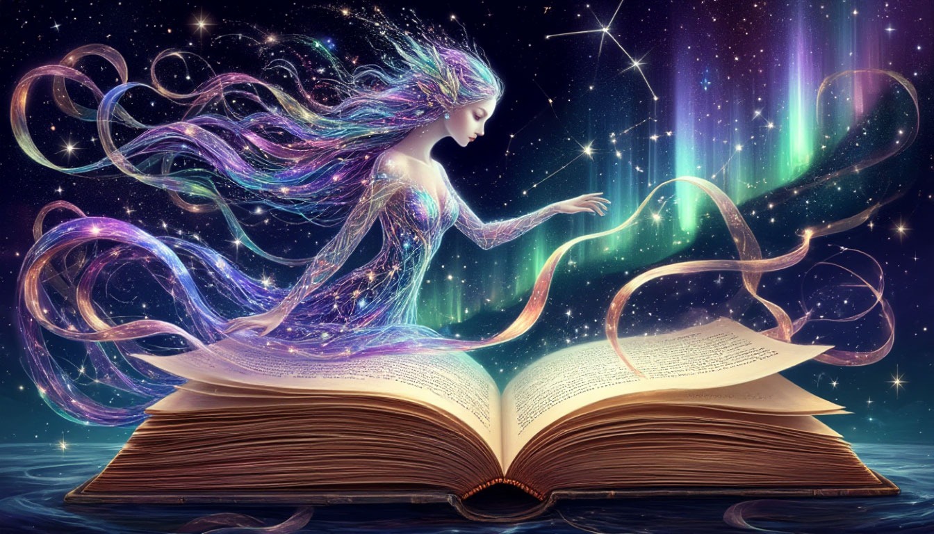 12. «Дух праздника»: A magical creature, the Spirit of New Year, embodied as a graceful feminine figure woven from constellations, starlight, and flowing aurora borealis ribbons. She gently turns the last page of a large, ancient book (the old year) and a blank, glowing page appears. Ethereal, dreamy, fantasy art style