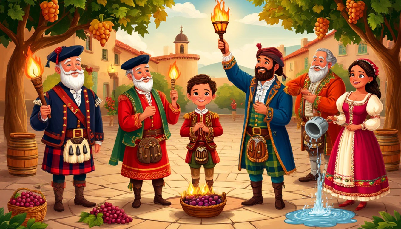 Мировые традиции: «Живая сцена в стиле детской книжной иллюстрации. На одной площади одновременно происходят разные ритуалы: шотландец с факелом, испанец с виноградом, японец у колокола, бразильянка у воды. Все в национальных костюмах, стиль — теплый, детализированный, волшебный».